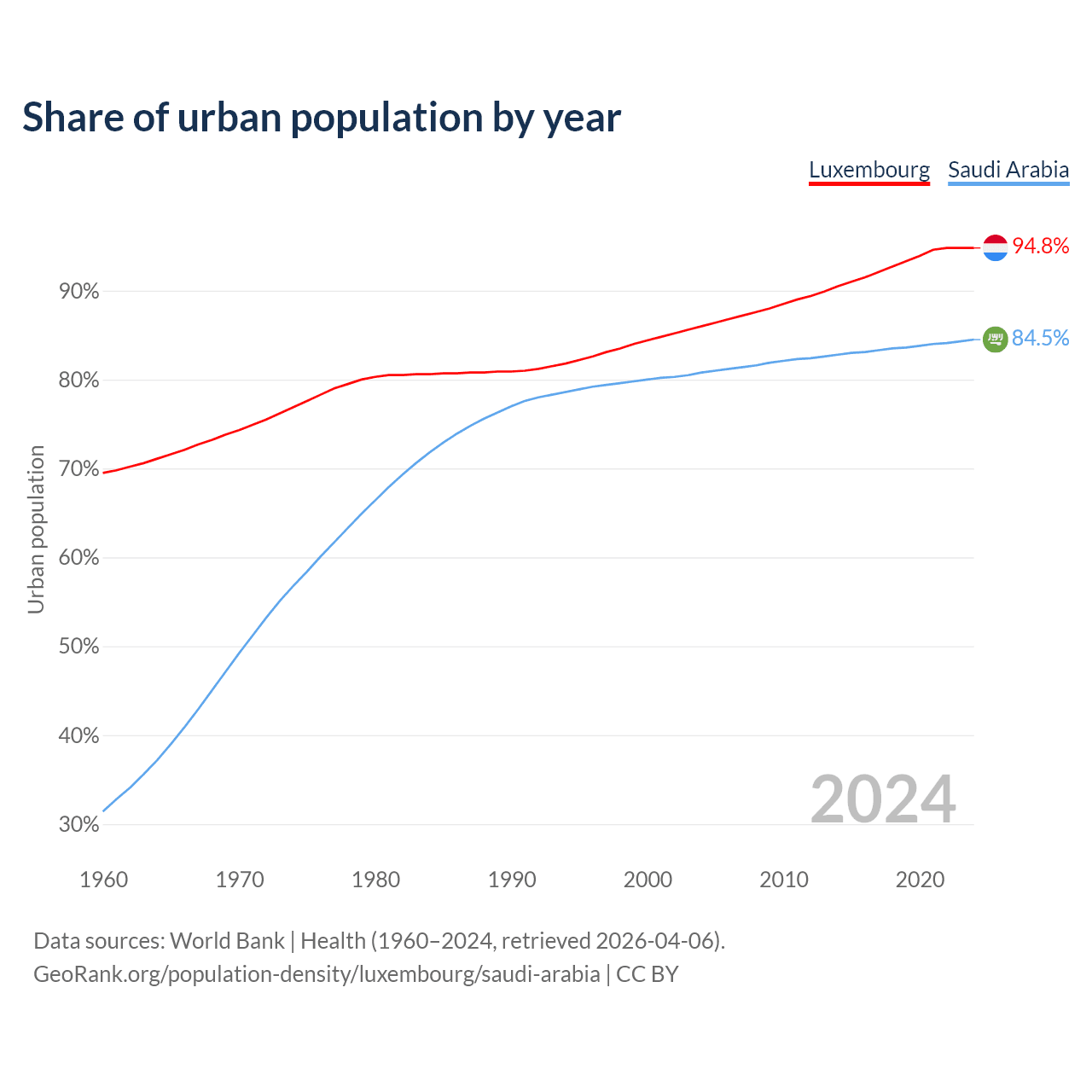 From 2004 to 2024, the share of urban population changed from 86% to 94.8% in Luxembourg and from 80.8% to 84.5% in Saudi Arabia.