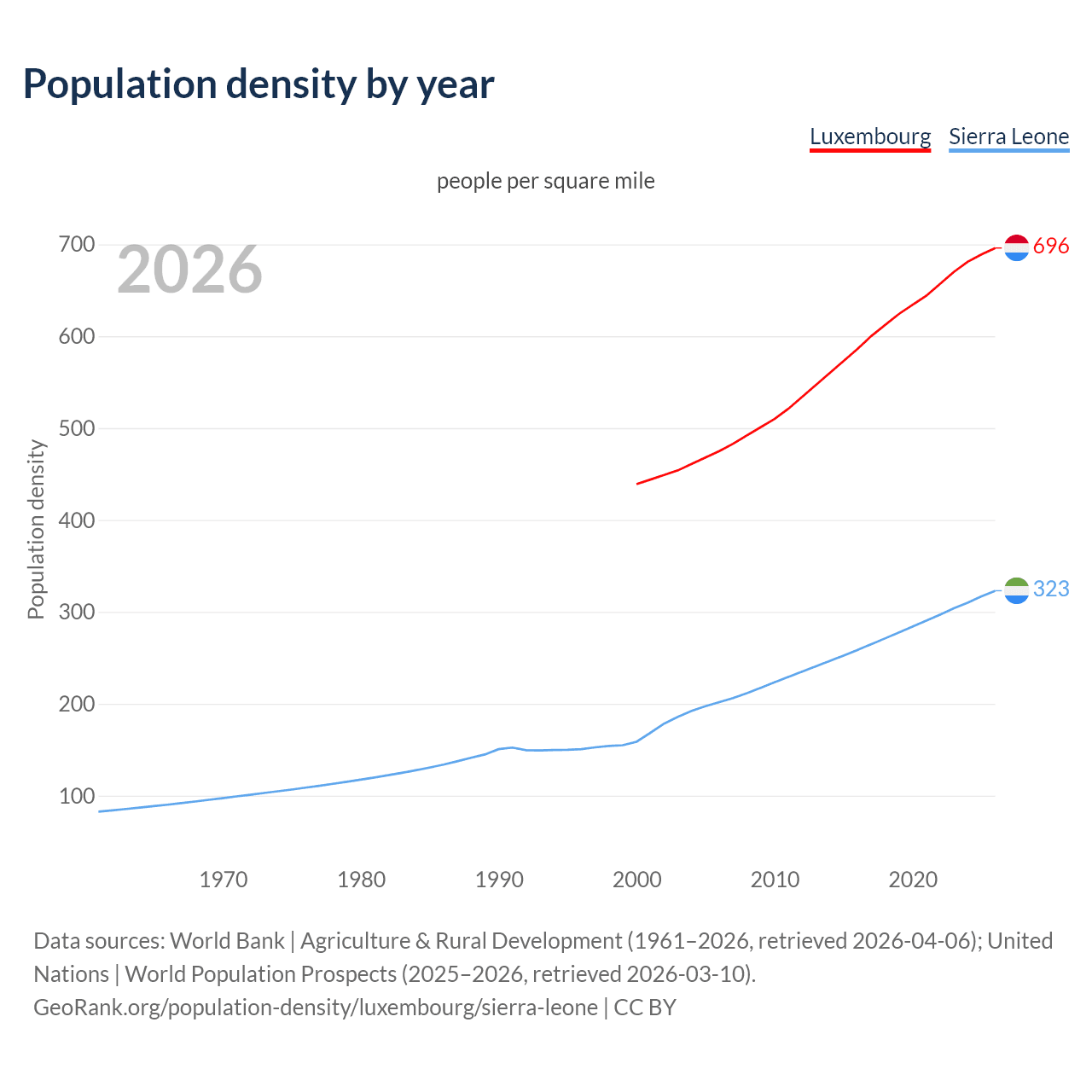 From 2006 to 2026, population density in Luxembourg increased by 46.4%, compared to a 60% growth in Sierra Leone.