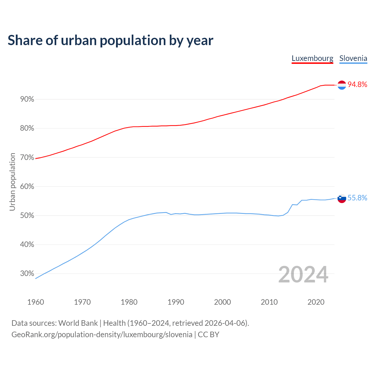 From 2004 to 2024, the share of urban population changed from 86% to 94.8% in Luxembourg and from 50.7% to 55.8% in Slovenia.