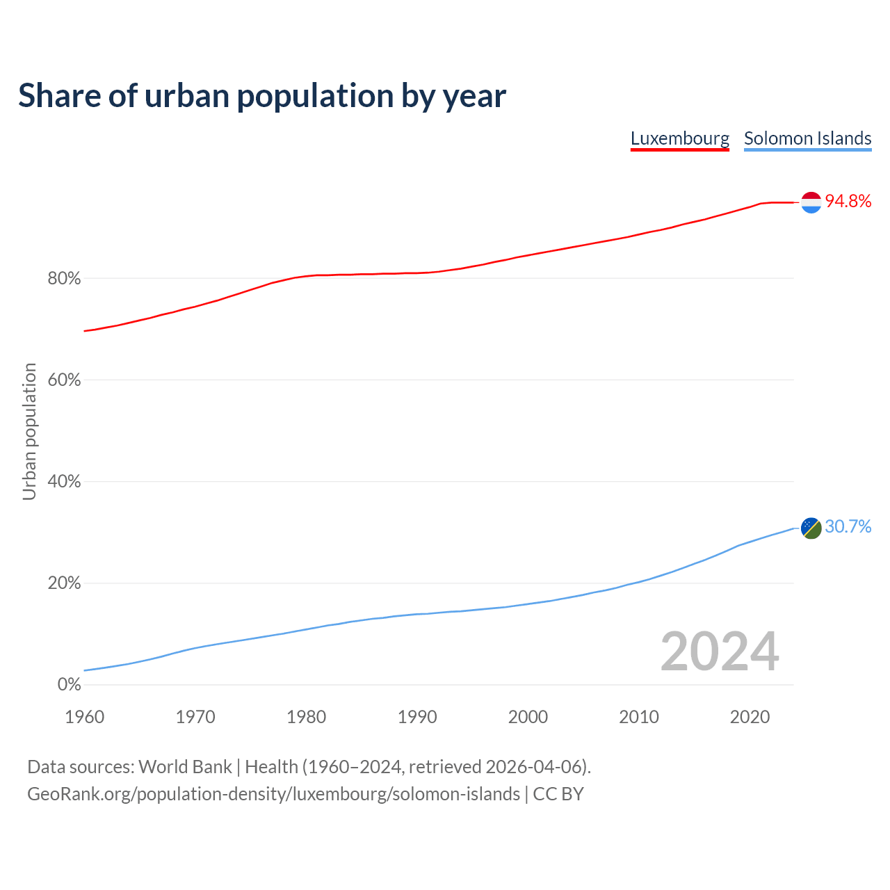 From 2004 to 2024, the share of urban population changed from 86% to 94.8% in Luxembourg and from 17.2% to 30.7% in the Solomon Islands.