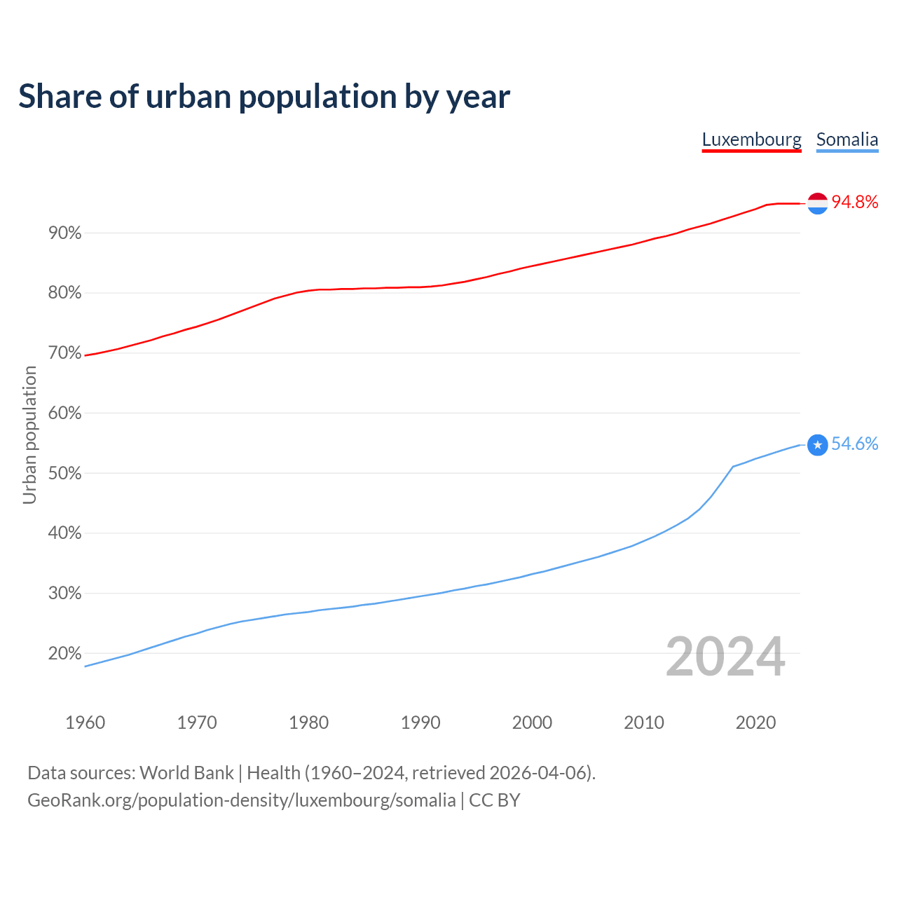 From 2004 to 2024, the share of urban population changed from 86% to 94.8% in Luxembourg and from 35% to 54.6% in Somalia.