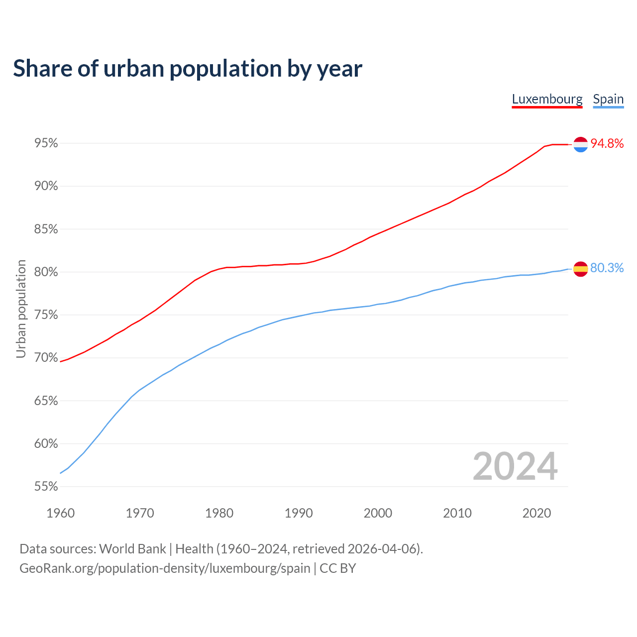 From 2004 to 2024, the share of urban population changed from 86% to 94.8% in Luxembourg and from 77% to 80.3% in Spain.