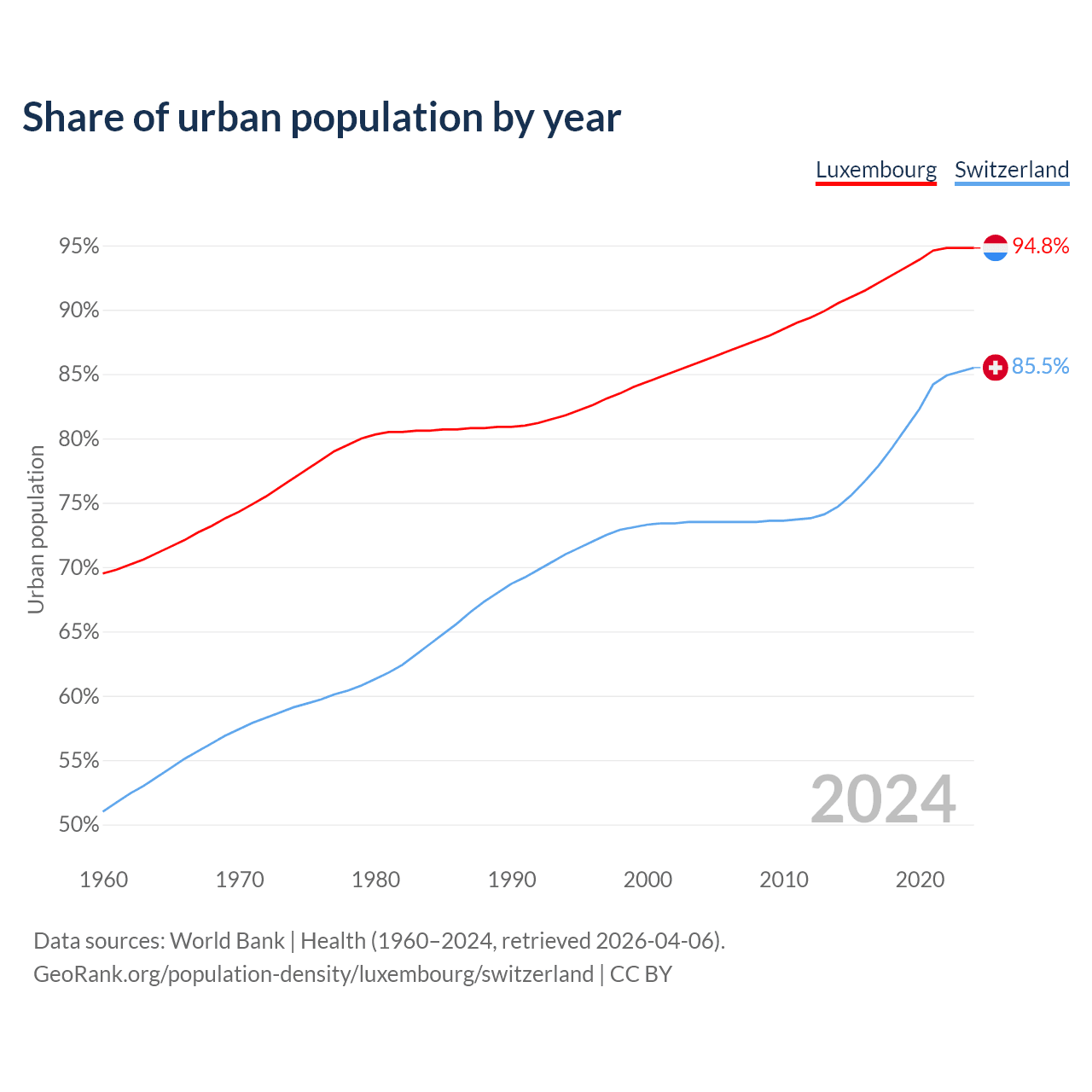 From 2004 to 2024, the share of urban population changed from 86% to 94.8% in Luxembourg and from 73.5% to 85.5% in Switzerland.