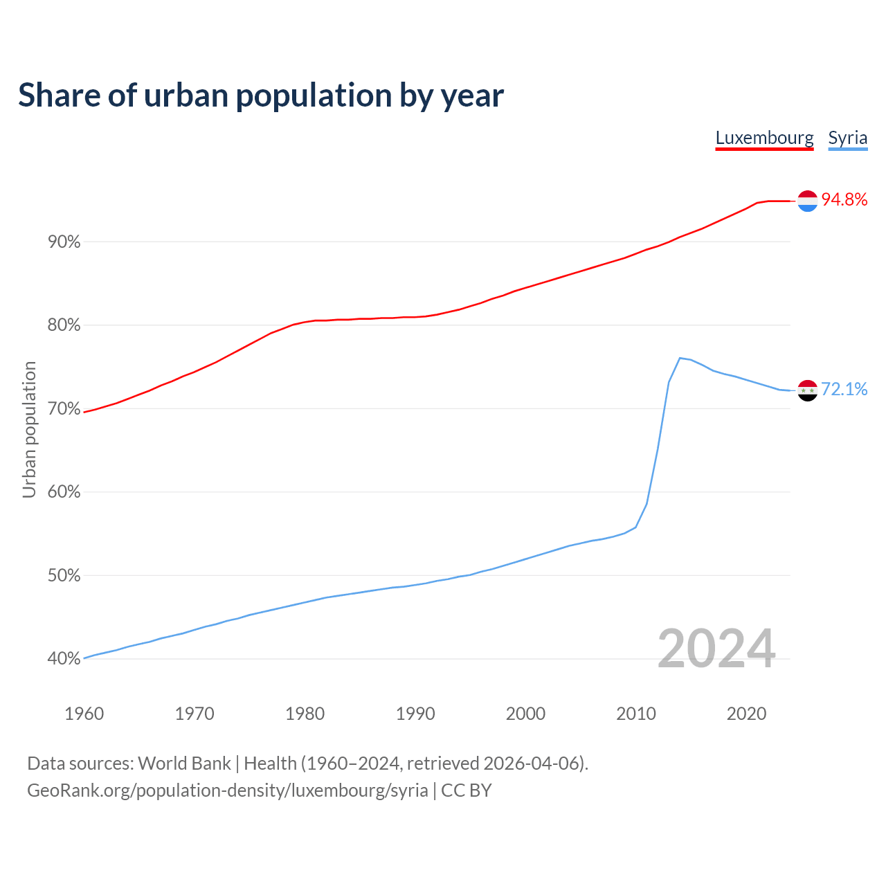 From 2006 to 2026, population density in Luxembourg increased by 46.4%, compared to a 35.5% growth in Syria.