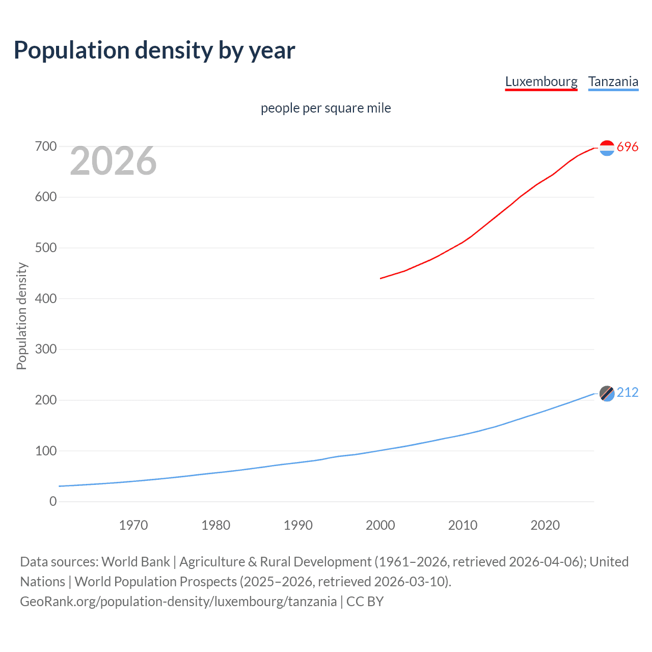 From 2006 to 2026, population density in Luxembourg increased by 46.4%, compared to a 80.1% growth in Tanzania.