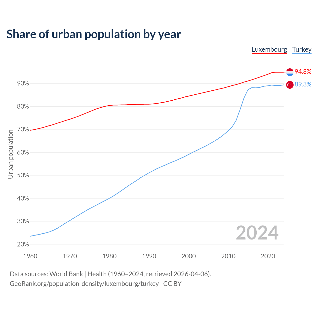 From 2004 to 2024, the share of urban population changed from 86% to 94.8% in Luxembourg and from 62.4% to 89.3% in Turkey.