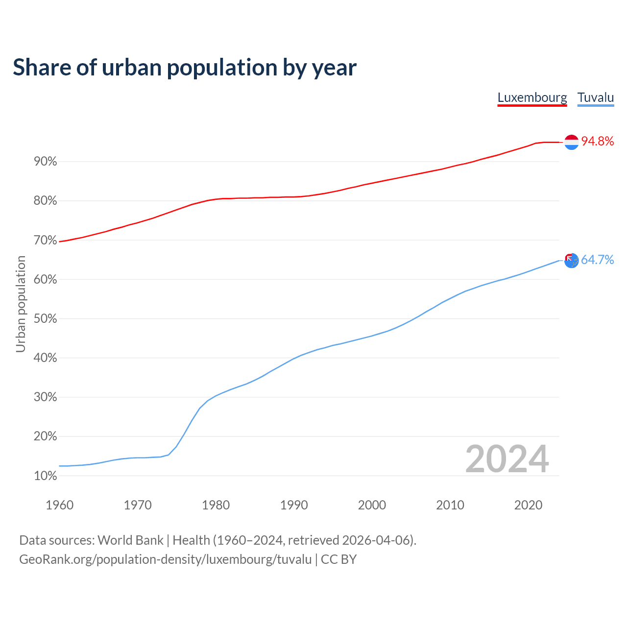 From 2004 to 2024, the share of urban population changed from 86% to 94.8% in Luxembourg and from 48.4% to 64.7% in Tuvalu.