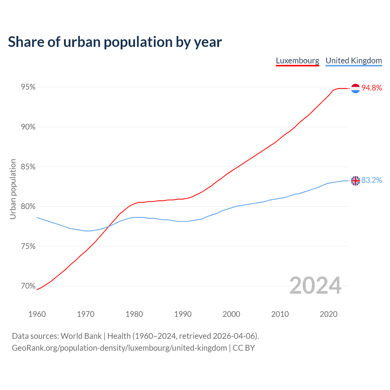 From 2004 to 2024, the share of urban population changed from 86% to 94.8% in Luxembourg and from 80.3% to 83.2% in the United Kingdom.