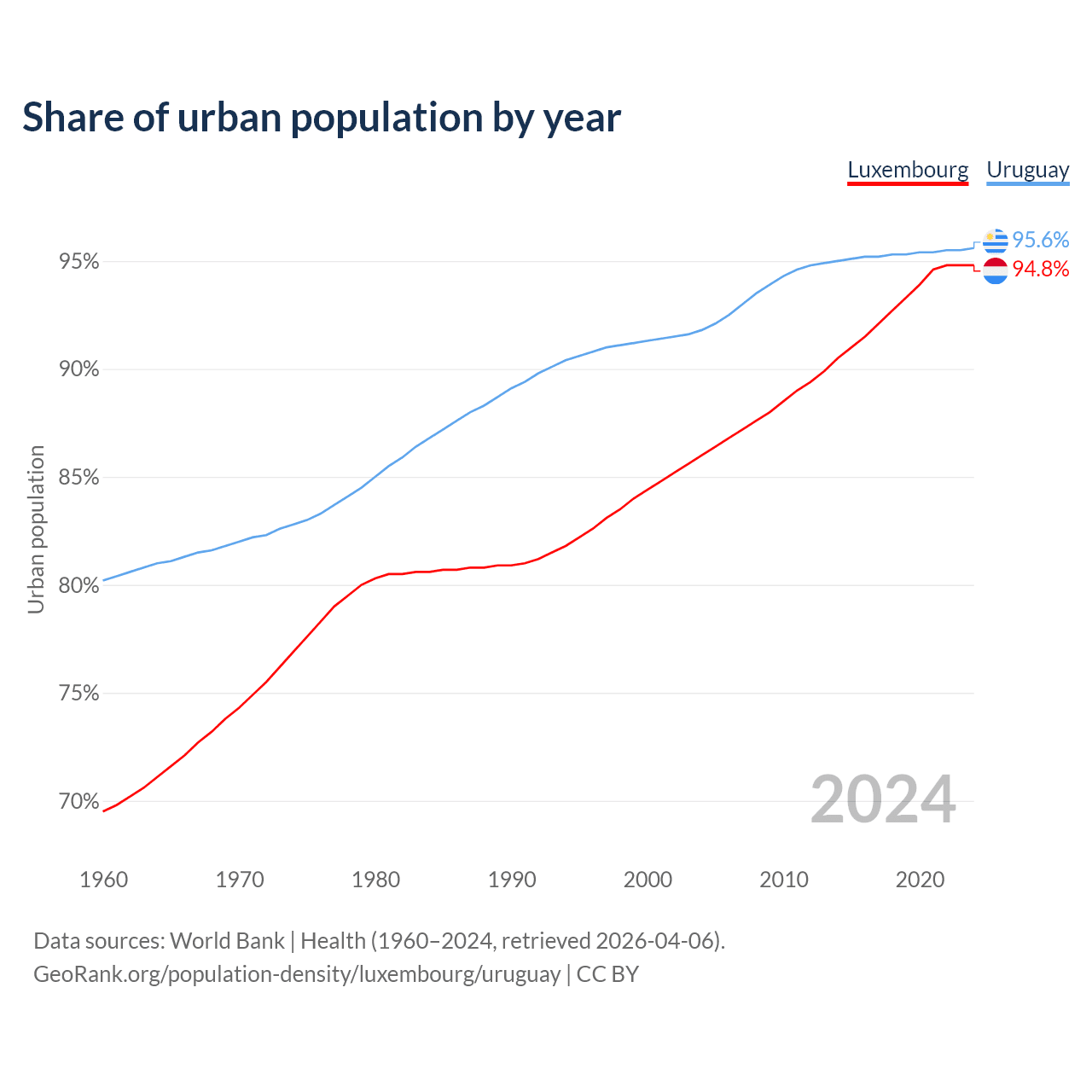 From 2004 to 2024, the share of urban population changed from 86% to 94.8% in Luxembourg and from 91.8% to 95.6% in Uruguay.