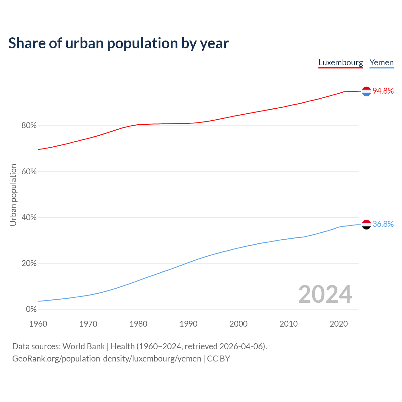 From 2004 to 2024, the share of urban population changed from 86% to 94.8% in Luxembourg and from 28.5% to 36.8% in Yemen.