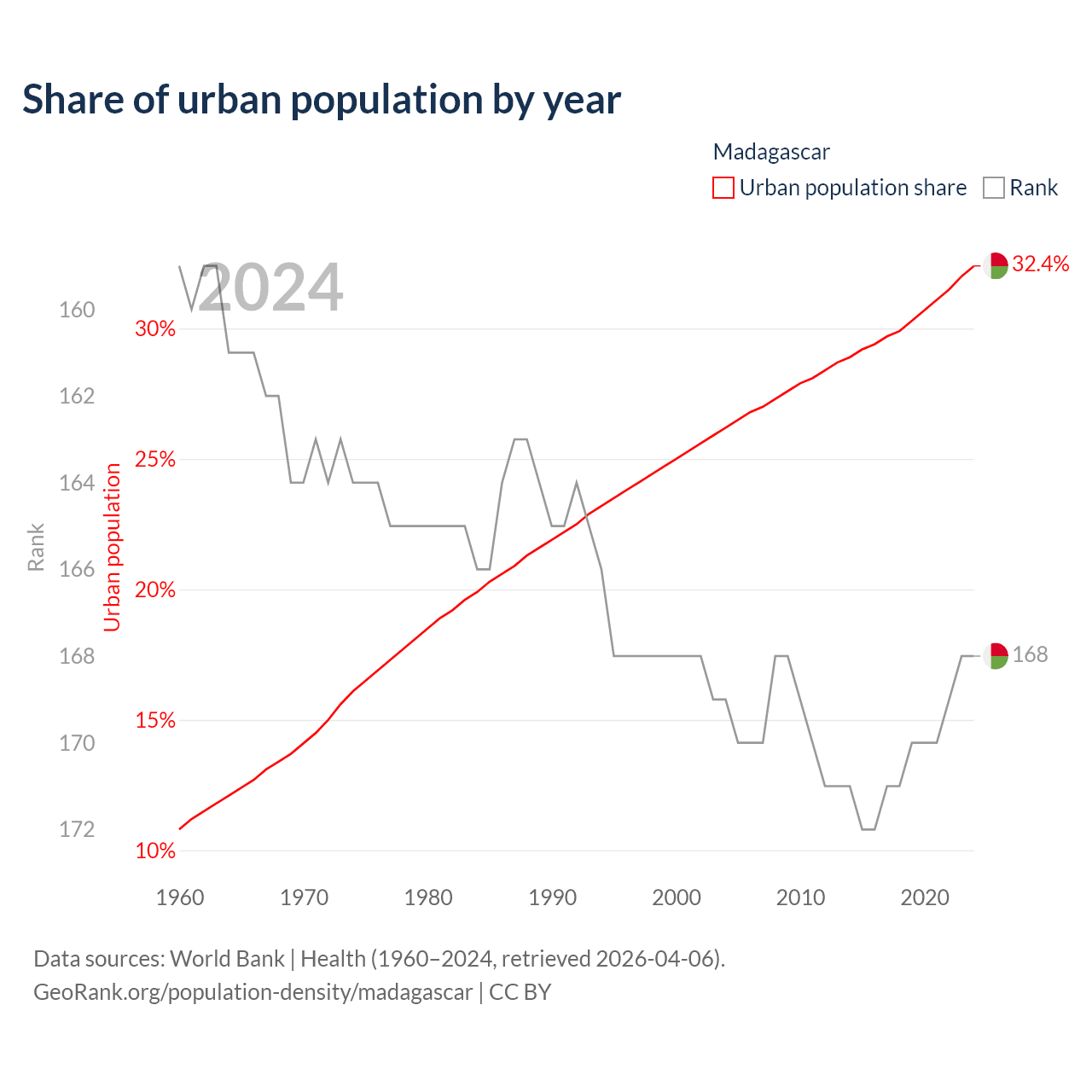 This chart shows the share of urban population in Madagascar from 1960 to 2024: 10.8% lived in urban areas in 1960, 25% in 2000, and 32.4% in 2024.