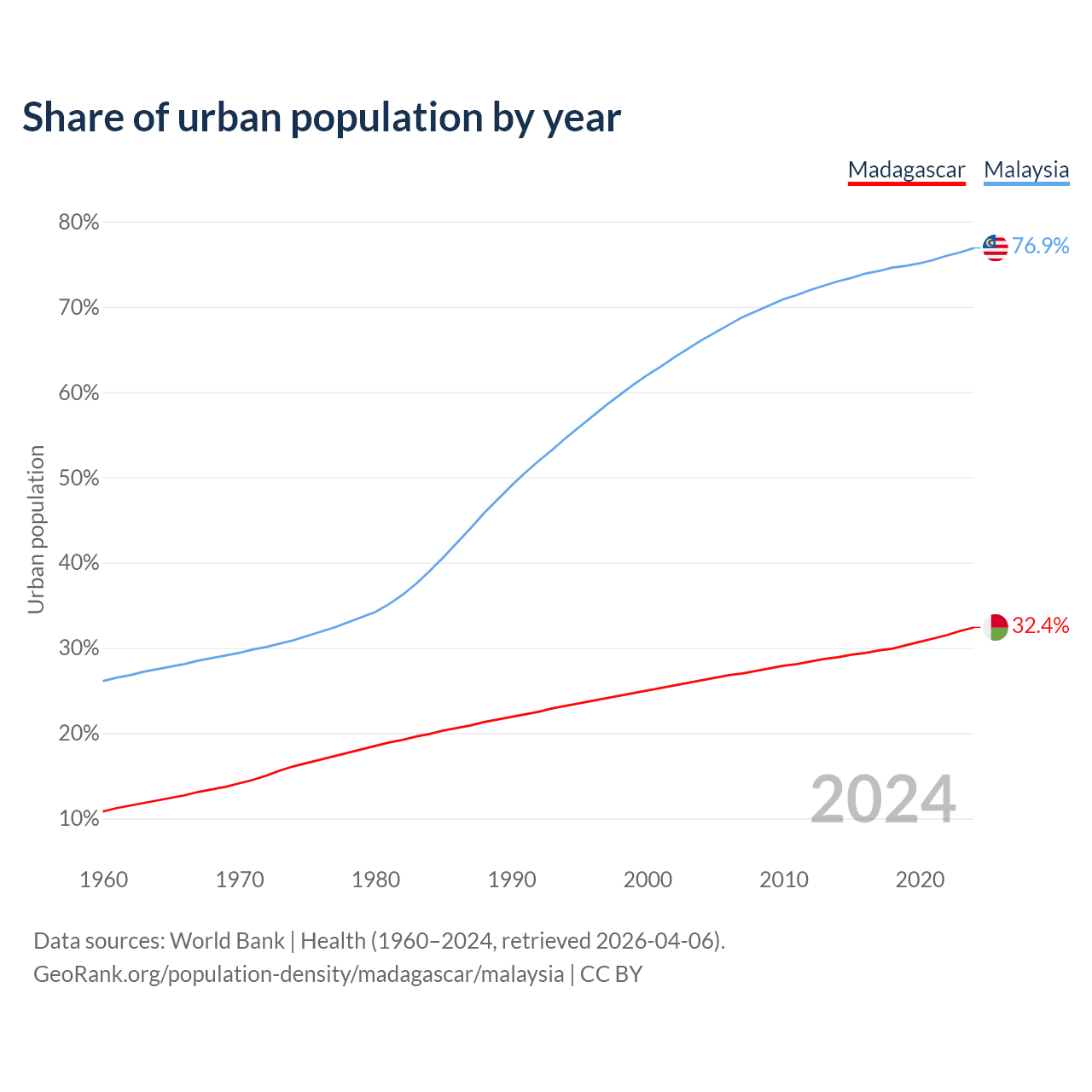 From 2004 to 2024, the share of urban population changed from 26.2% to 32.4% in Madagascar and from 66.1% to 76.9% in Malaysia.