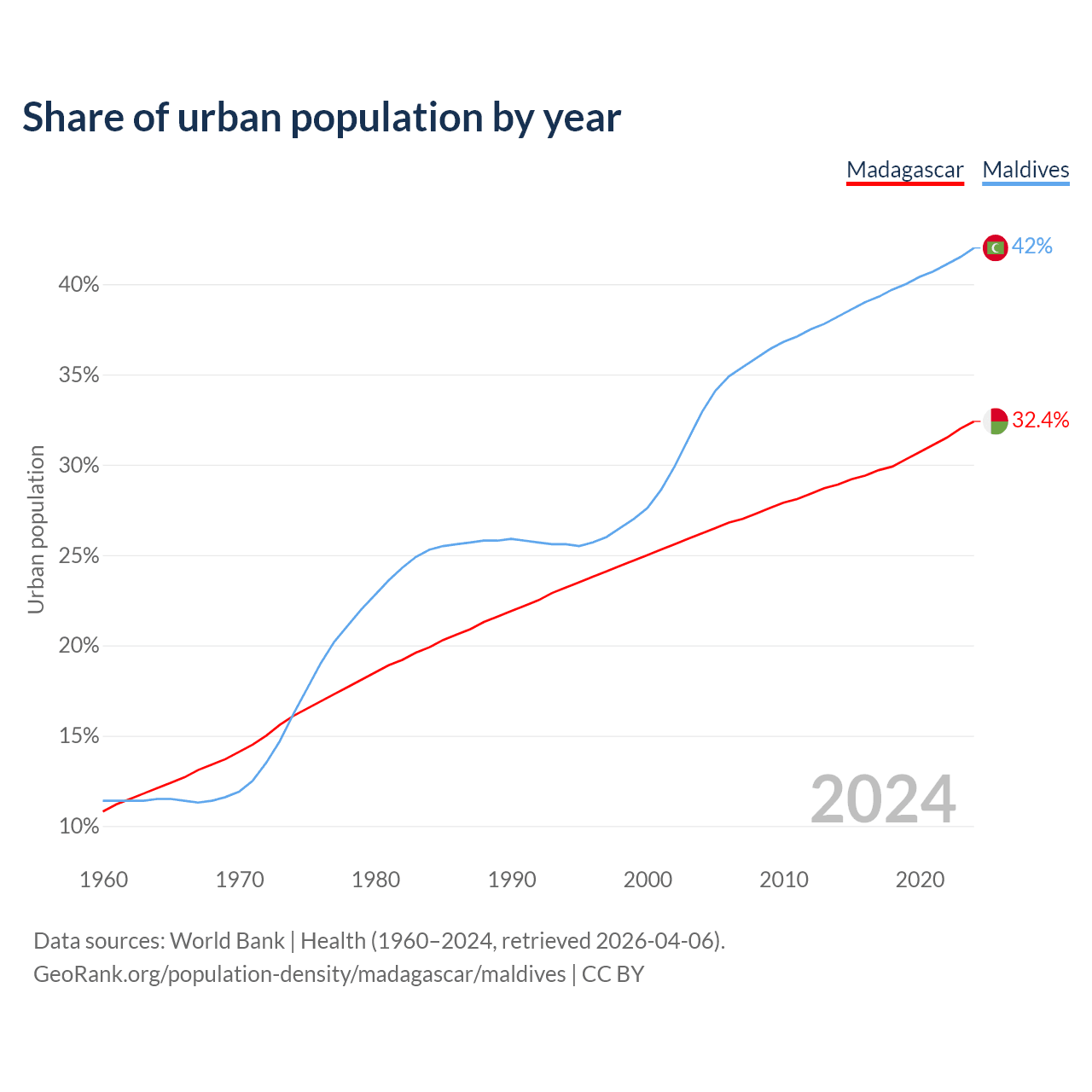 From 2004 to 2024, the share of urban population changed from 26.2% to 32.4% in Madagascar and from 32.9% to 42% in Maldives.