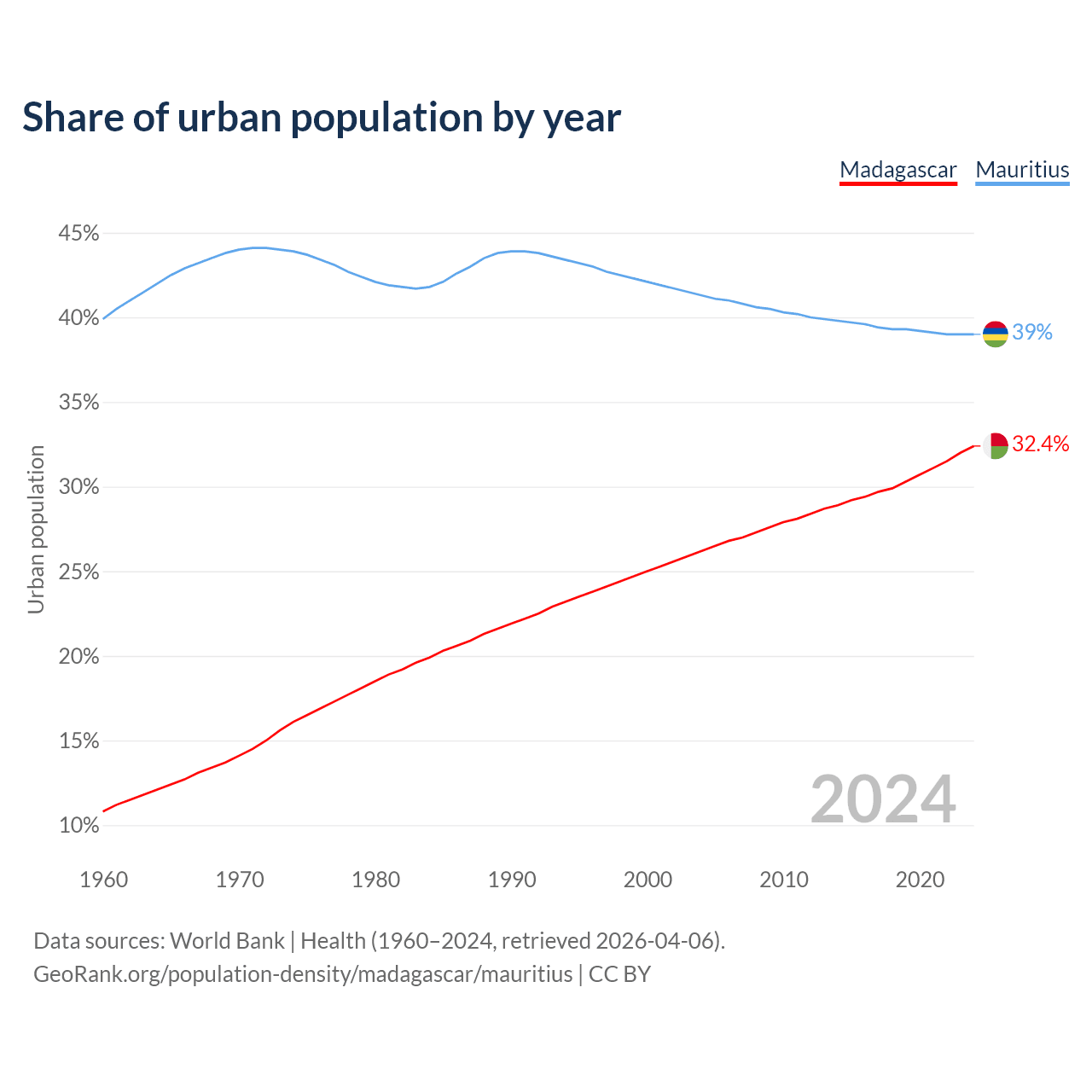 From 2004 to 2024, the share of urban population changed from 26.2% to 32.4% in Madagascar and from 41.3% to 39% in Mauritius.