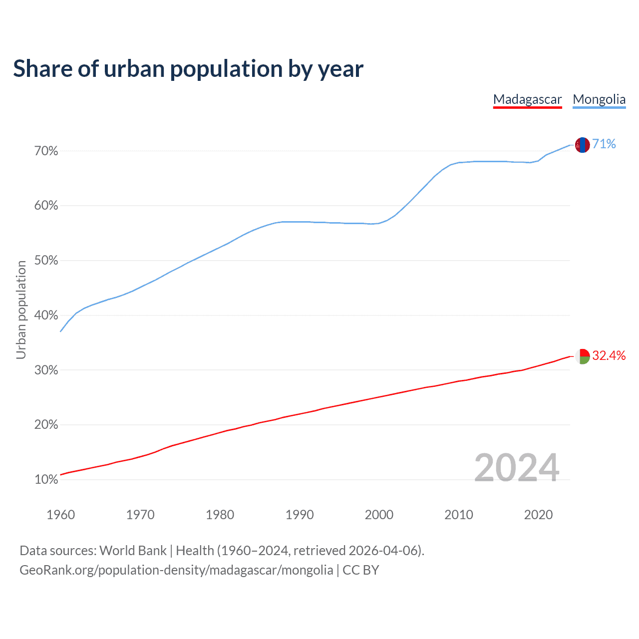 From 2004 to 2024, the share of urban population changed from 26.2% to 32.4% in Madagascar and from 60.8% to 71% in Mongolia.