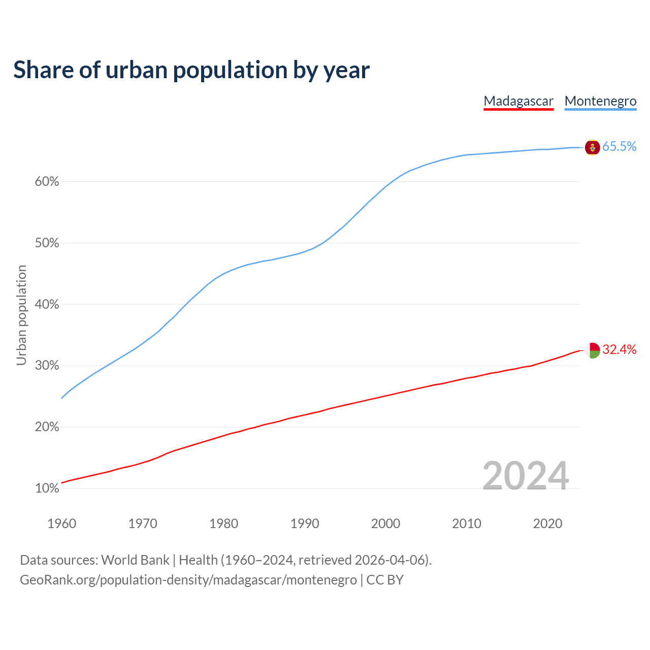 From 2004 to 2024, the share of urban population changed from 26.2% to 32.4% in Madagascar and from 62.2% to 65.5% in Montenegro.