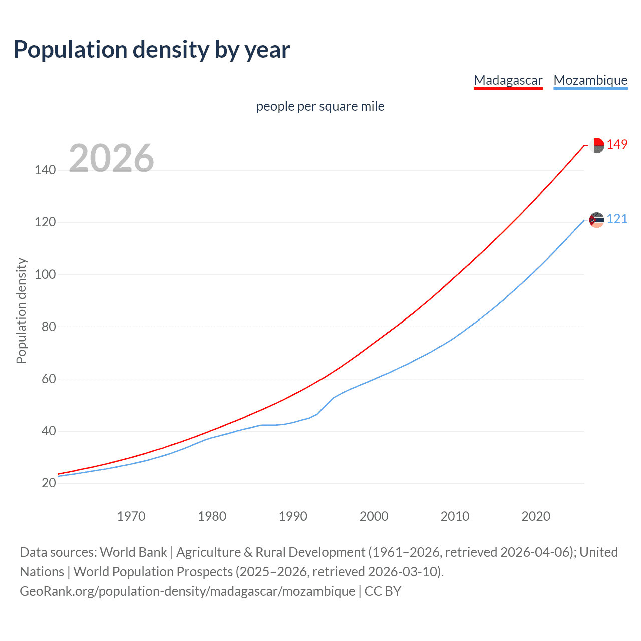 From 2006 to 2026, population density in Madagascar increased by 69.9%, compared to a 76.4% growth in Mozambique.