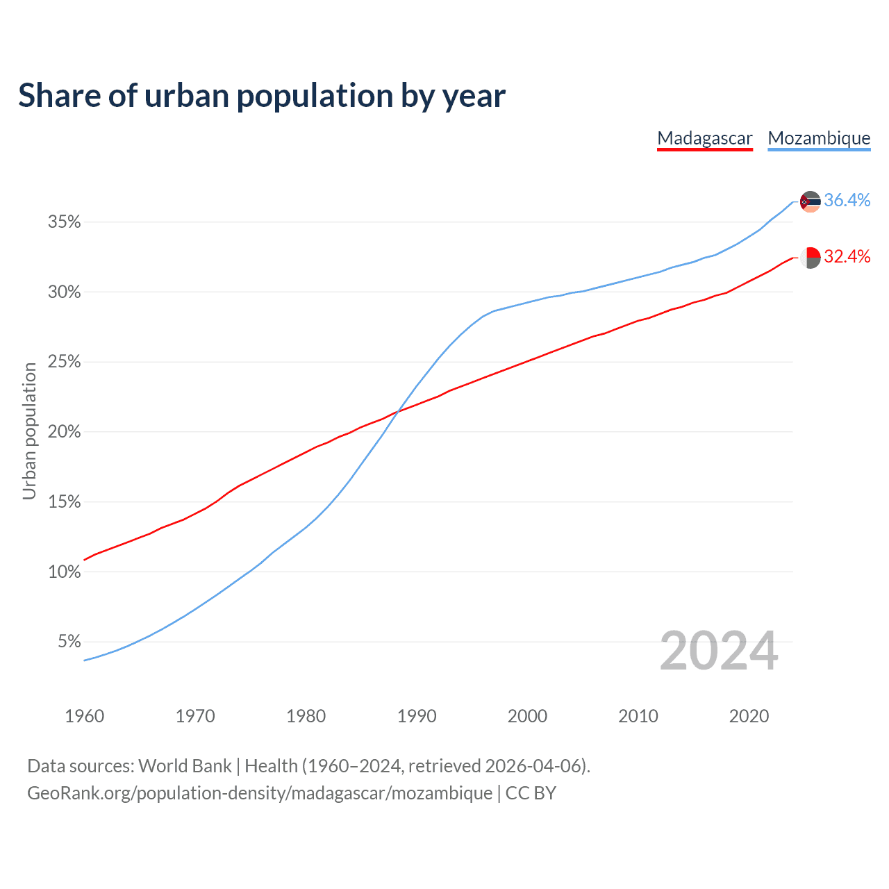 From 2004 to 2024, the share of urban population changed from 26.2% to 32.4% in Madagascar and from 29.9% to 36.4% in Mozambique.