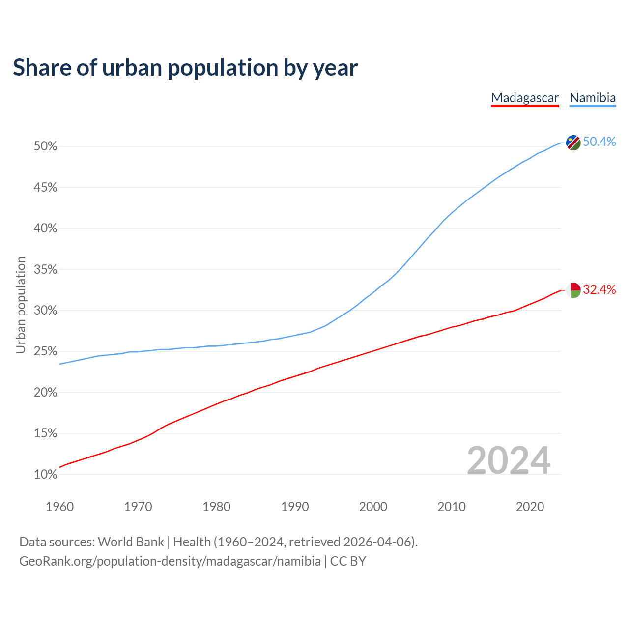 From 2004 to 2024, the share of urban population changed from 26.2% to 32.4% in Madagascar and from 35.5% to 50.4% in Namibia.