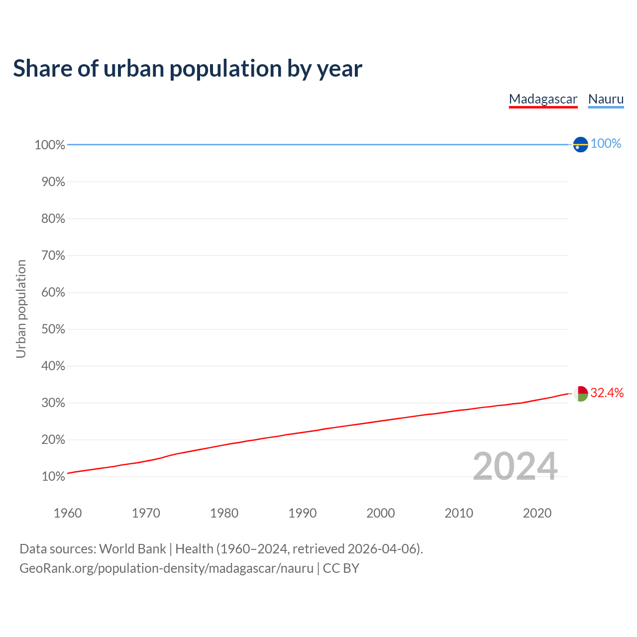 From 2004 to 2024, the share of urban population changed from 26.2% to 32.4% in Madagascar and from 100% to 100% in Nauru.
