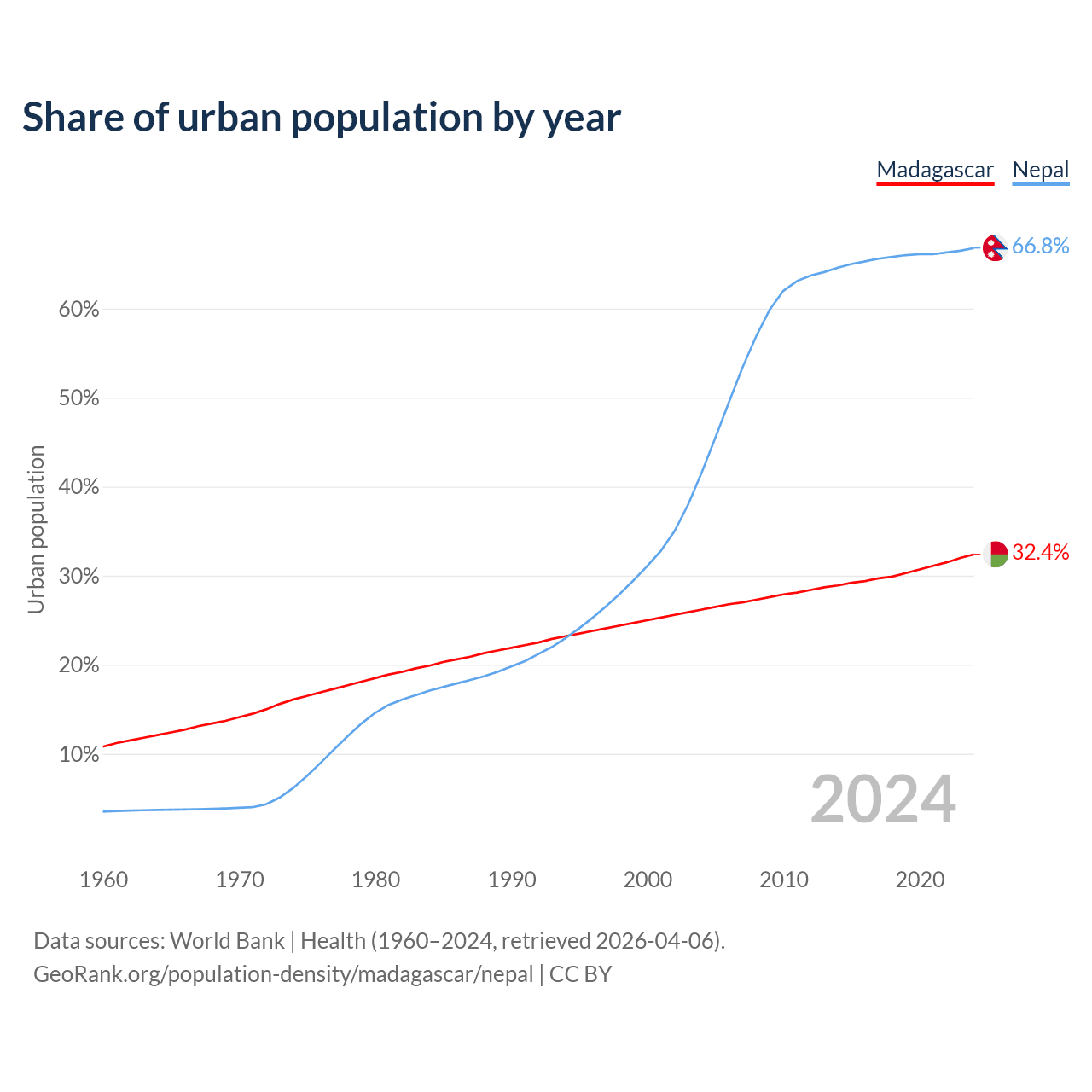 From 2004 to 2024, the share of urban population changed from 26.2% to 32.4% in Madagascar and from 41.6% to 66.8% in Nepal.