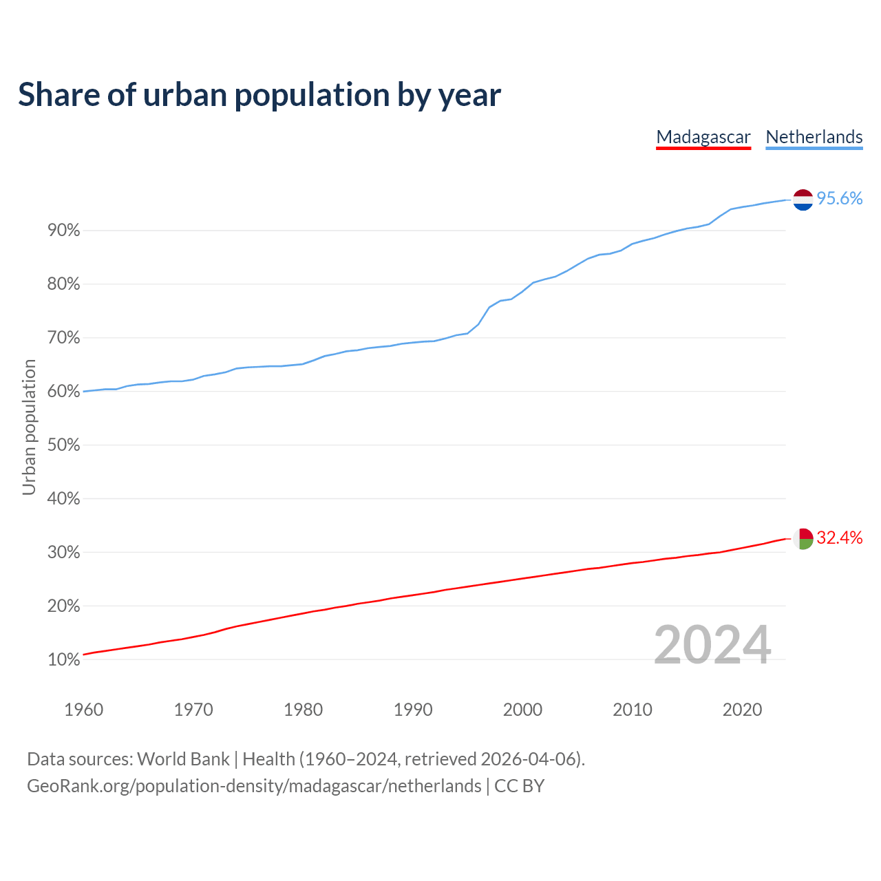 From 2004 to 2024, the share of urban population changed from 26.2% to 32.4% in Madagascar and from 82.3% to 95.6% in the Netherlands.