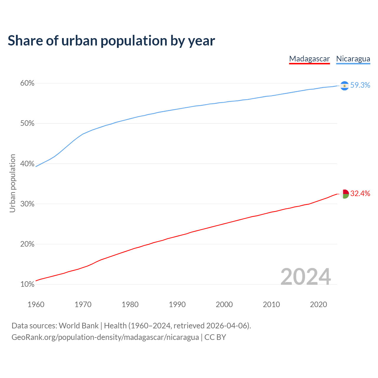 From 2004 to 2024, the share of urban population changed from 26.2% to 32.4% in Madagascar and from 55.8% to 59.3% in Nicaragua.