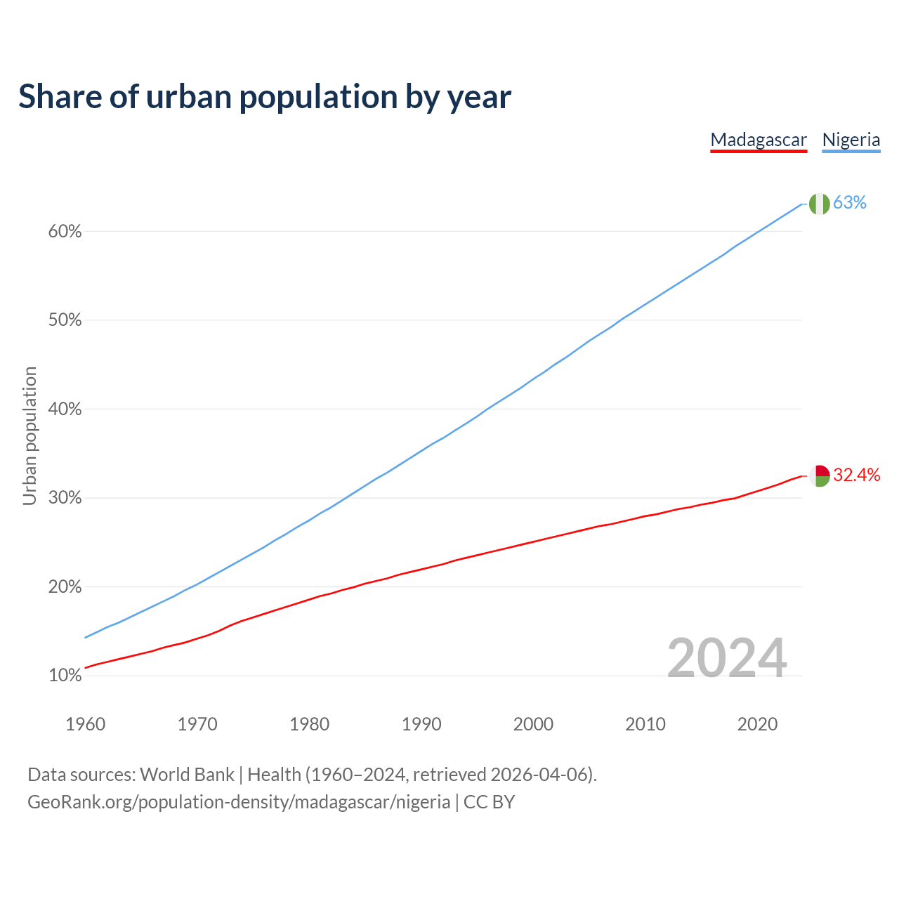 From 2004 to 2024, the share of urban population changed from 26.2% to 32.4% in Madagascar and from 46.7% to 63% in Nigeria.
