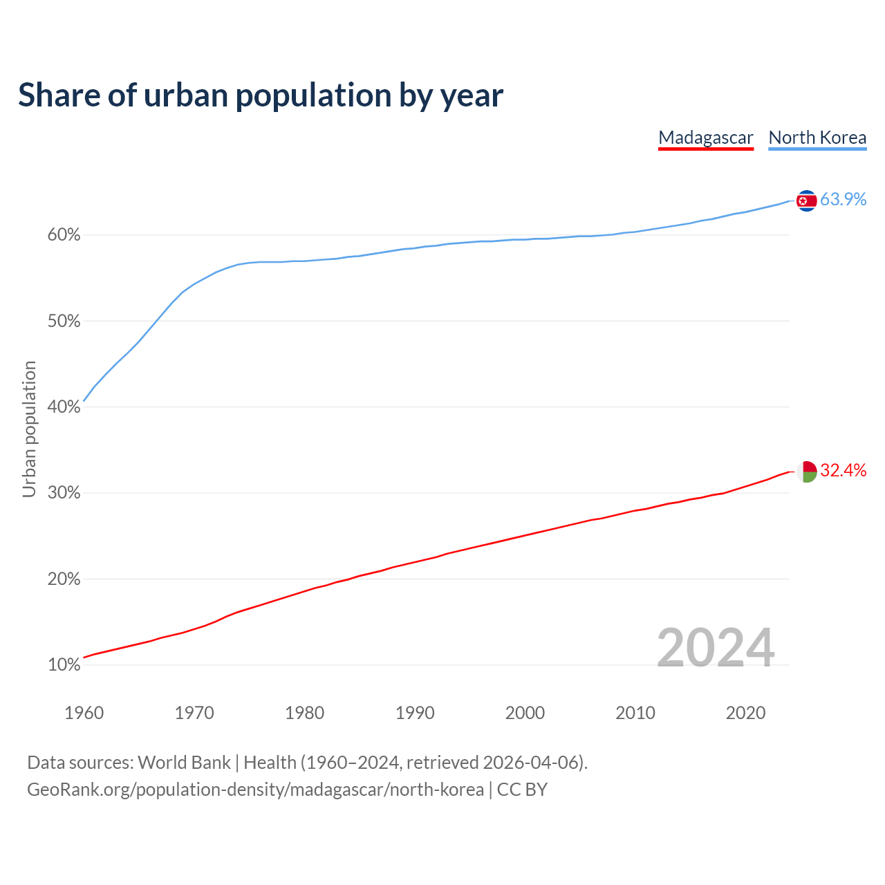 From 2004 to 2024, the share of urban population changed from 26.2% to 32.4% in Madagascar and from 59.7% to 63.9% in North Korea.