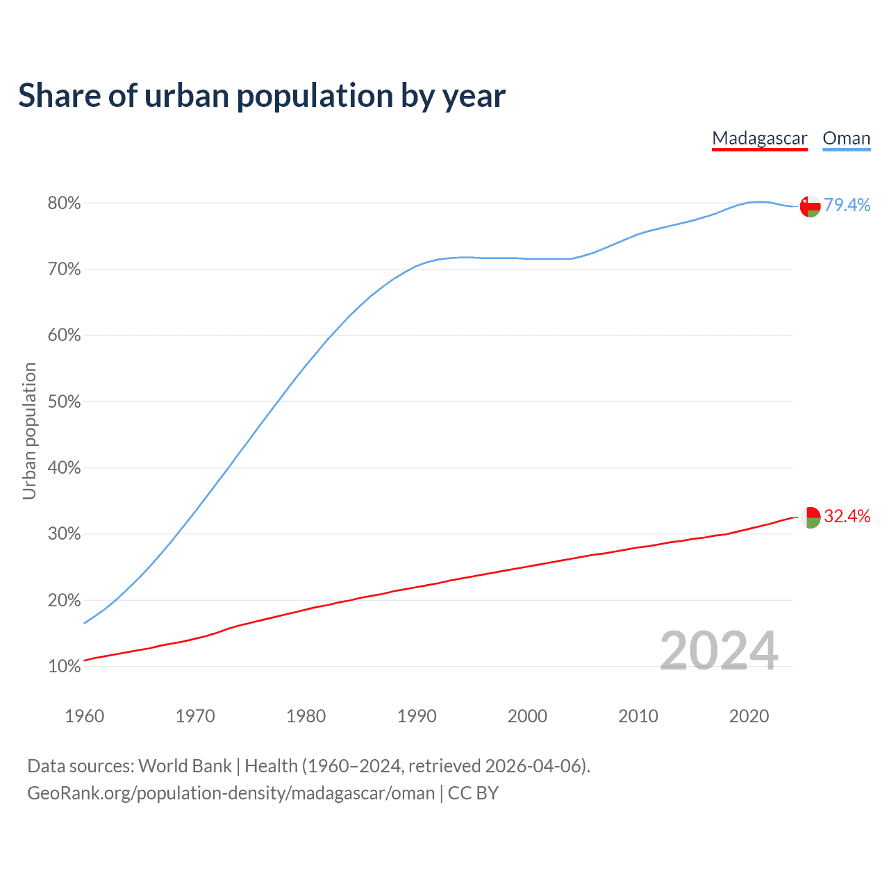 From 2004 to 2024, the share of urban population changed from 26.2% to 32.4% in Madagascar and from 71.5% to 79.4% in Oman.