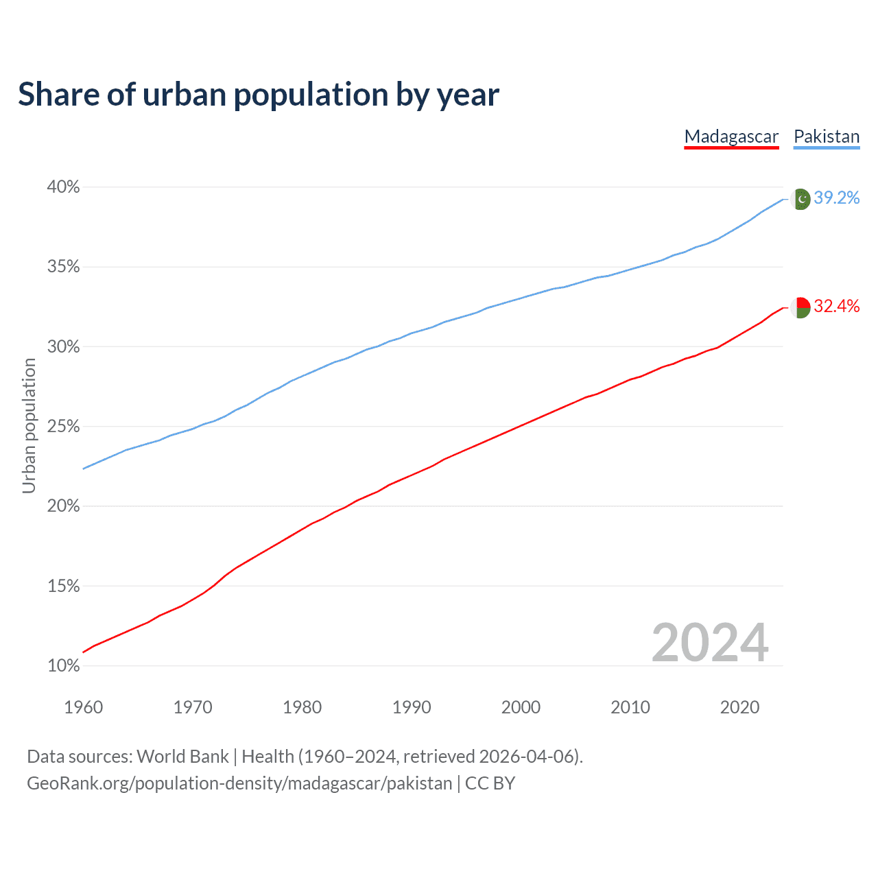 From 2004 to 2024, the share of urban population changed from 26.2% to 32.4% in Madagascar and from 33.7% to 39.2% in Pakistan.