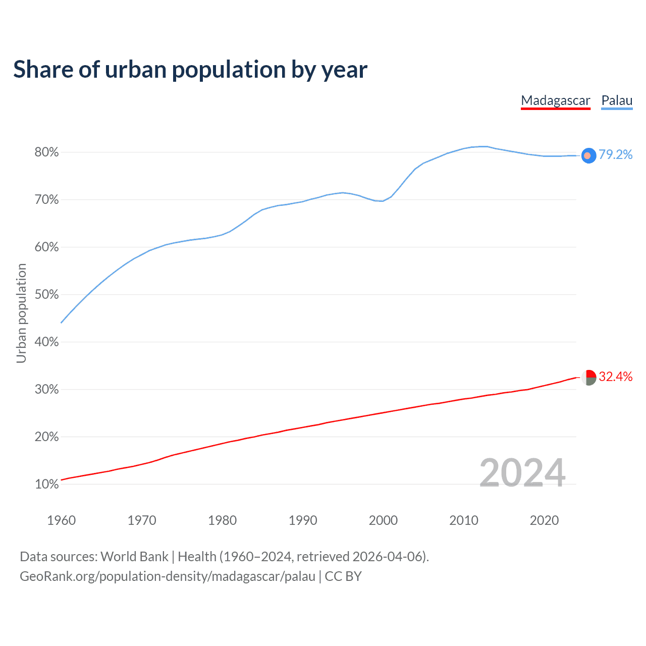 From 2004 to 2024, the share of urban population changed from 26.2% to 32.4% in Madagascar and from 76.4% to 79.2% in Palau.