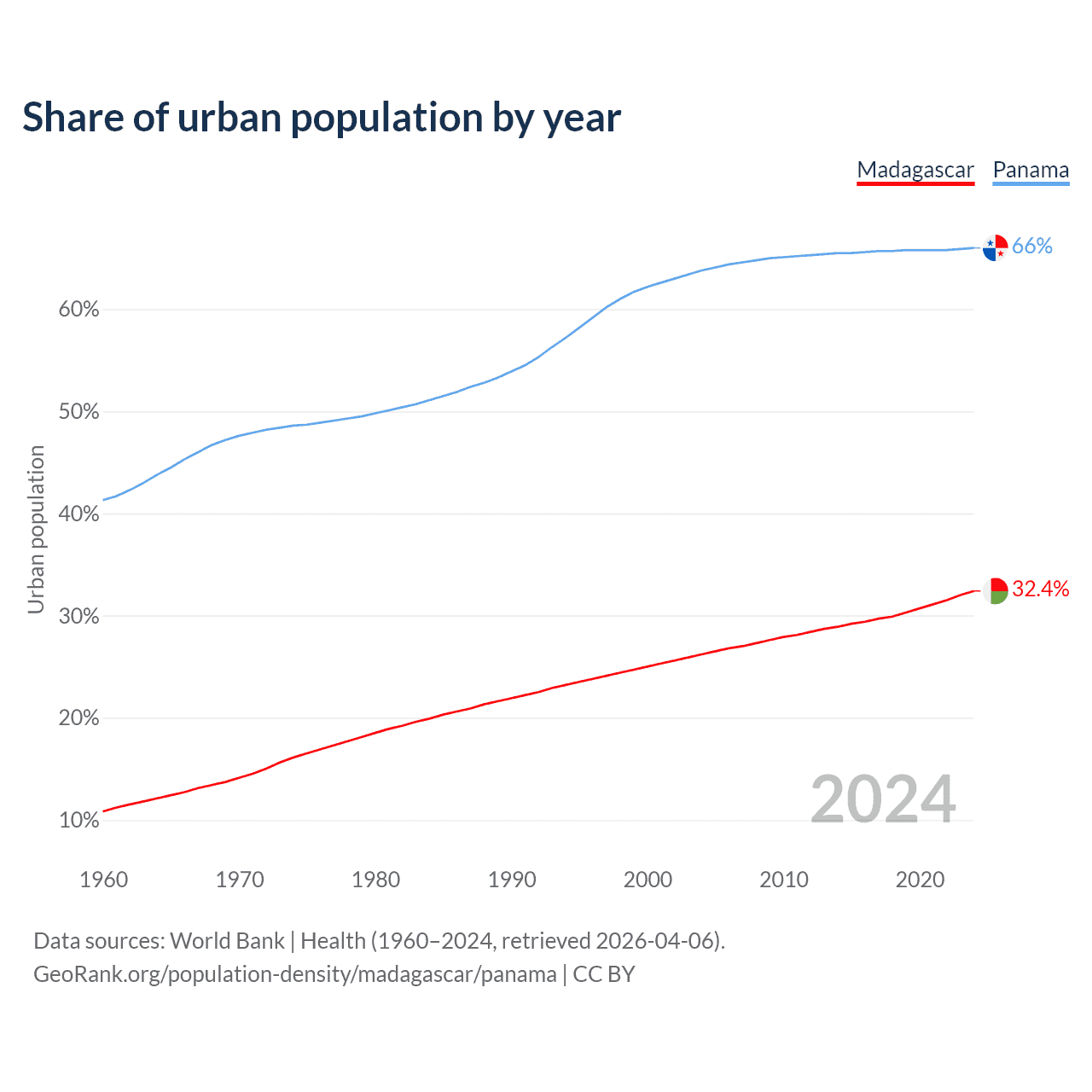 From 2004 to 2024, the share of urban population changed from 26.2% to 32.4% in Madagascar and from 63.8% to 66% in Panama.