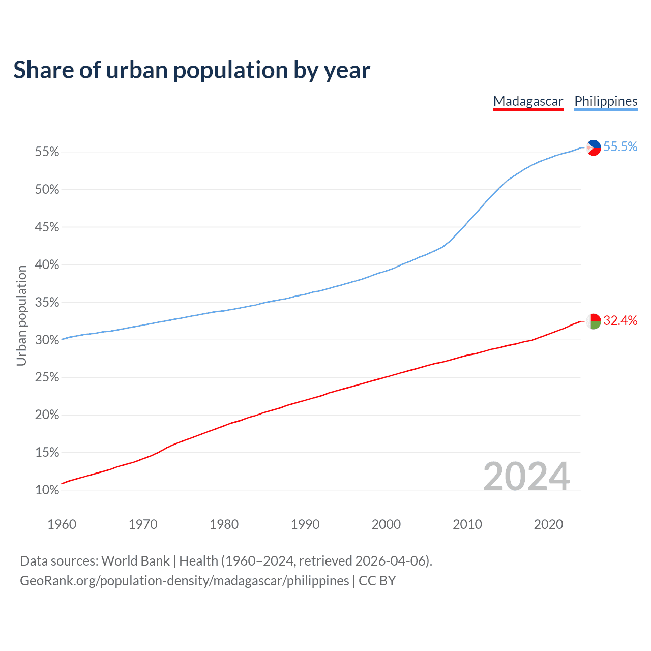 From 2004 to 2024, the share of urban population changed from 26.2% to 32.4% in Madagascar and from 40.9% to 55.5% in the Philippines.