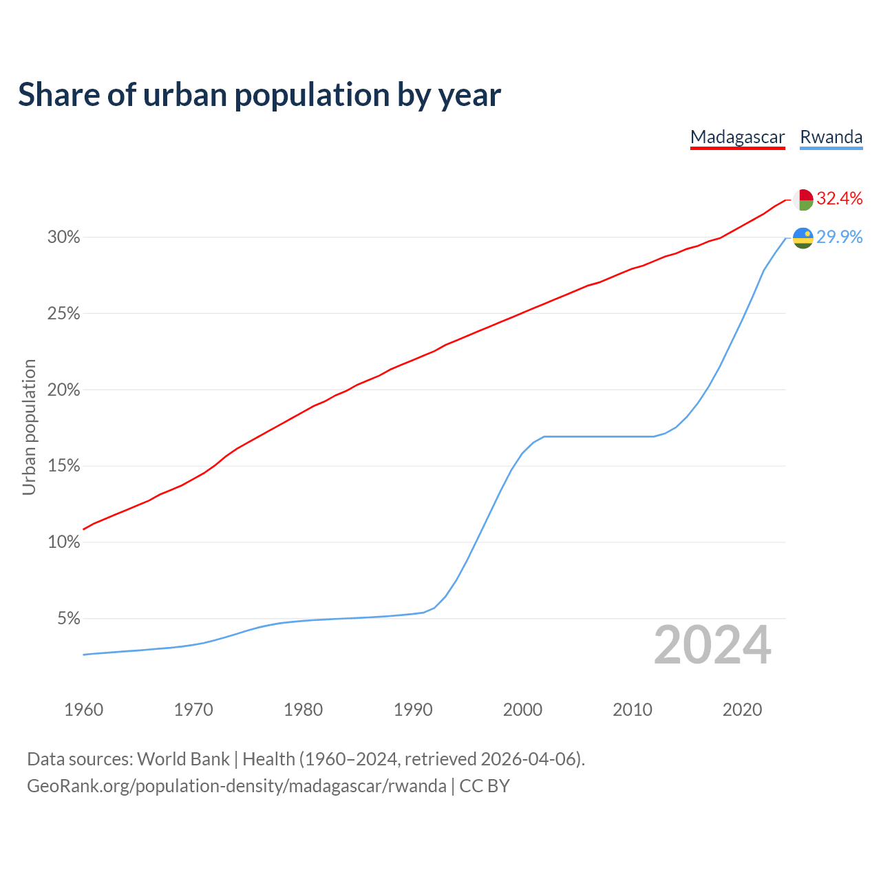 From 2004 to 2024, the share of urban population changed from 26.2% to 32.4% in Madagascar and from 16.9% to 29.9% in Rwanda.