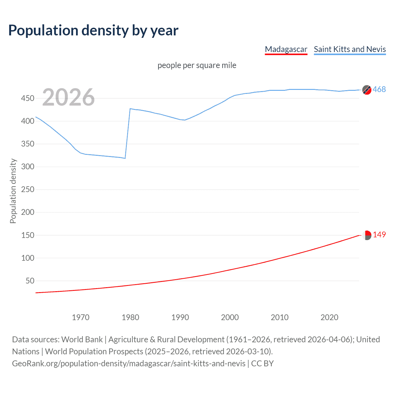 From 2006 to 2026, population density in Madagascar increased by 69.9%, compared to a 0.93% growth in Saint Kitts and Nevis.