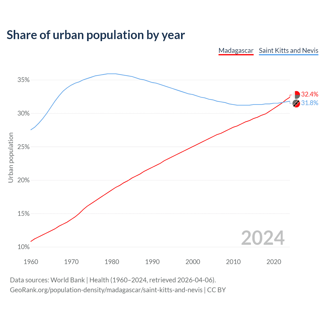 From 2004 to 2024, the share of urban population changed from 26.2% to 32.4% in Madagascar and from 32.1% to 31.8% in Saint Kitts and Nevis.