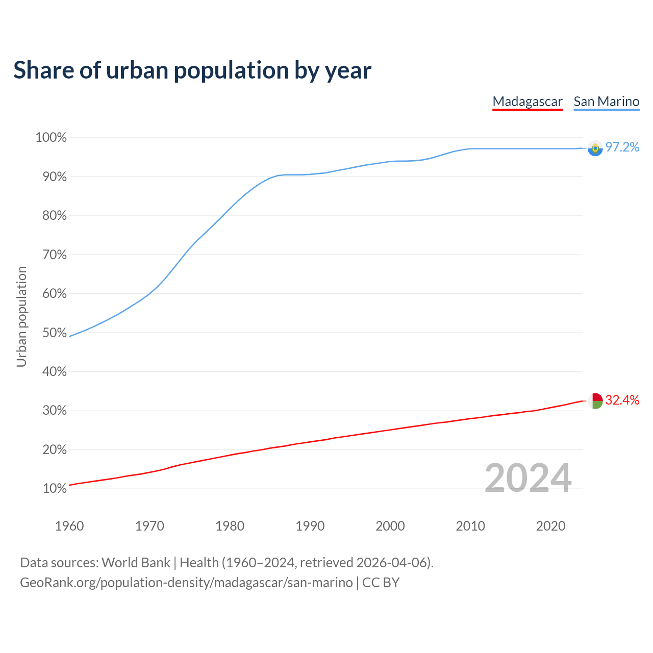 From 2004 to 2024, the share of urban population changed from 26.2% to 32.4% in Madagascar and from 94.2% to 97.2% in San Marino.