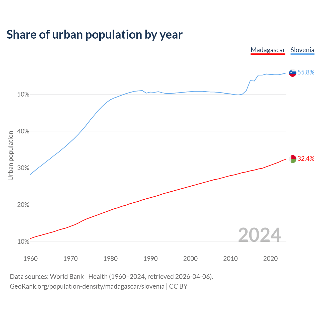 From 2004 to 2024, the share of urban population changed from 26.2% to 32.4% in Madagascar and from 50.7% to 55.8% in Slovenia.