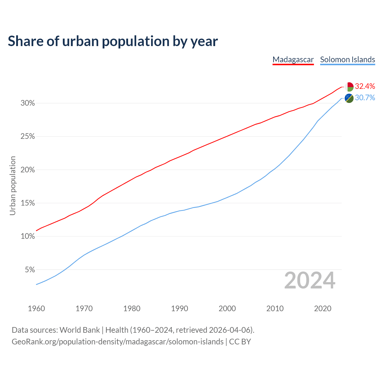 From 2004 to 2024, the share of urban population changed from 26.2% to 32.4% in Madagascar and from 17.2% to 30.7% in the Solomon Islands.