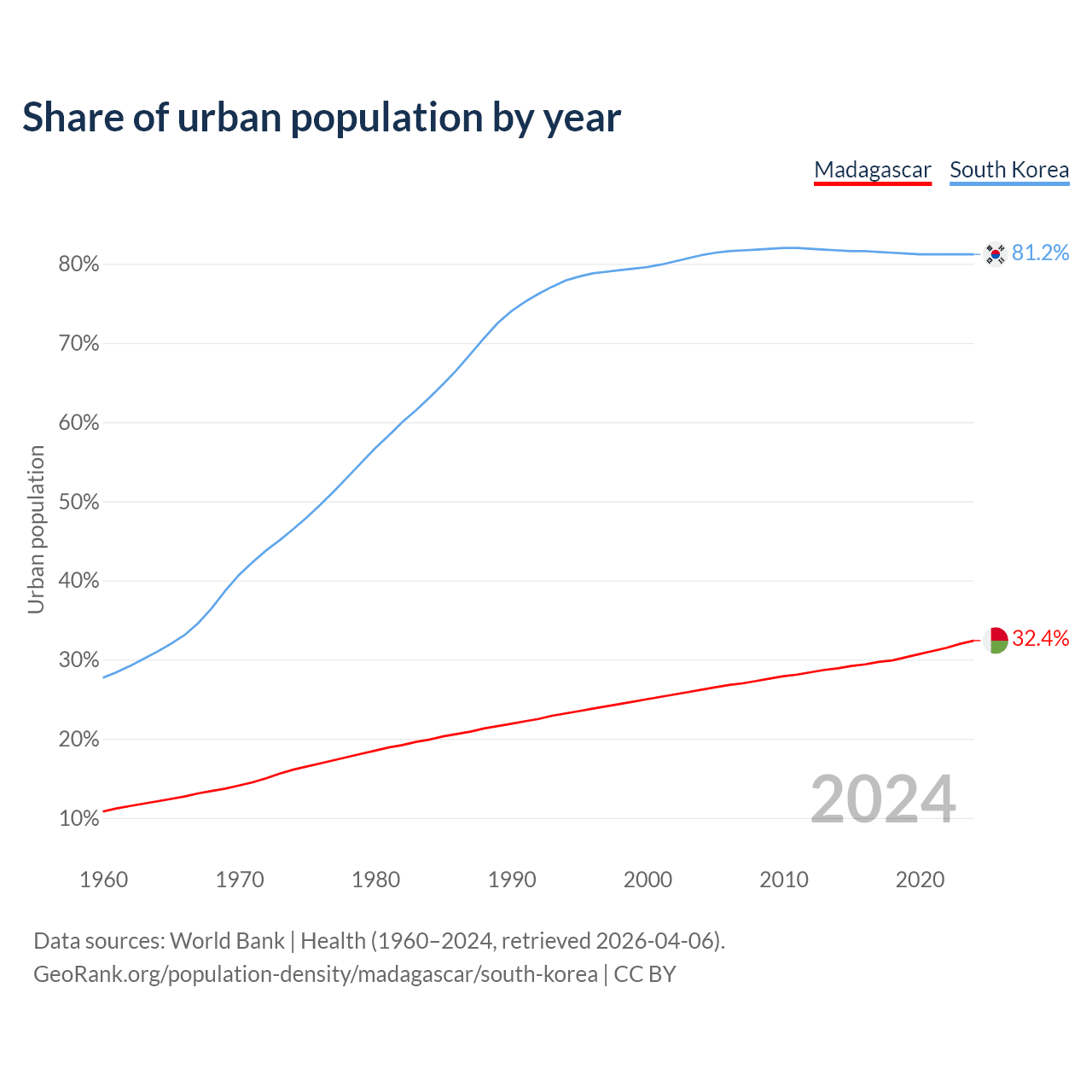 From 2004 to 2024, the share of urban population changed from 26.2% to 32.4% in Madagascar and from 81.1% to 81.2% in South Korea.