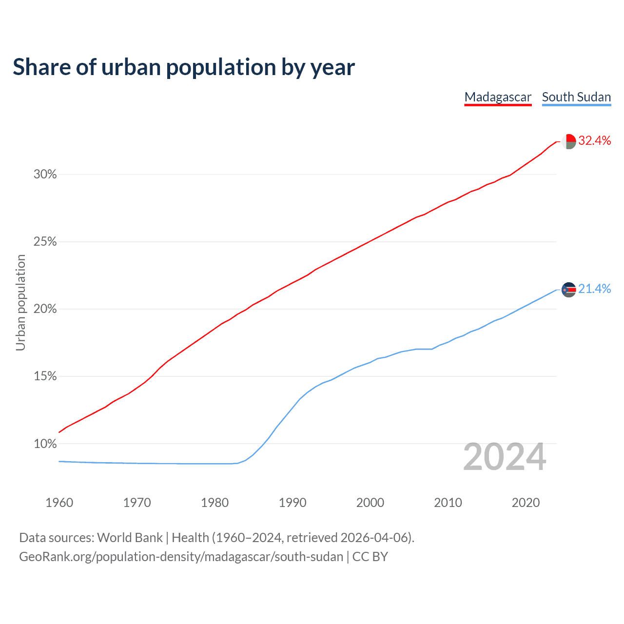 From 2004 to 2024, the share of urban population changed from 26.2% to 32.4% in Madagascar and from 16.8% to 21.4% in South Sudan.