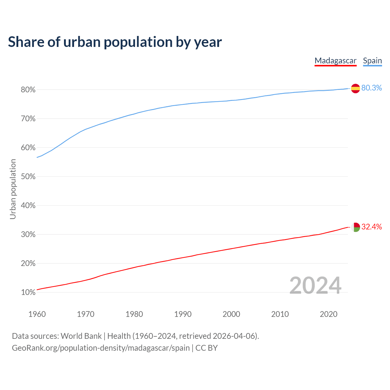 From 2004 to 2024, the share of urban population changed from 26.2% to 32.4% in Madagascar and from 77% to 80.3% in Spain.