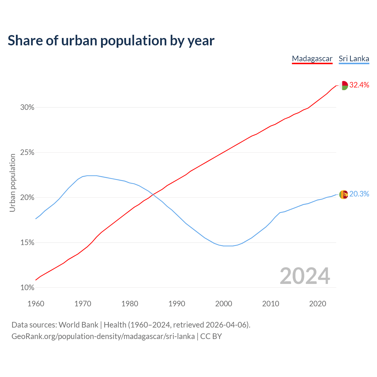 From 2004 to 2024, the share of urban population changed from 26.2% to 32.4% in Madagascar and from 14.9% to 20.3% in Sri Lanka.