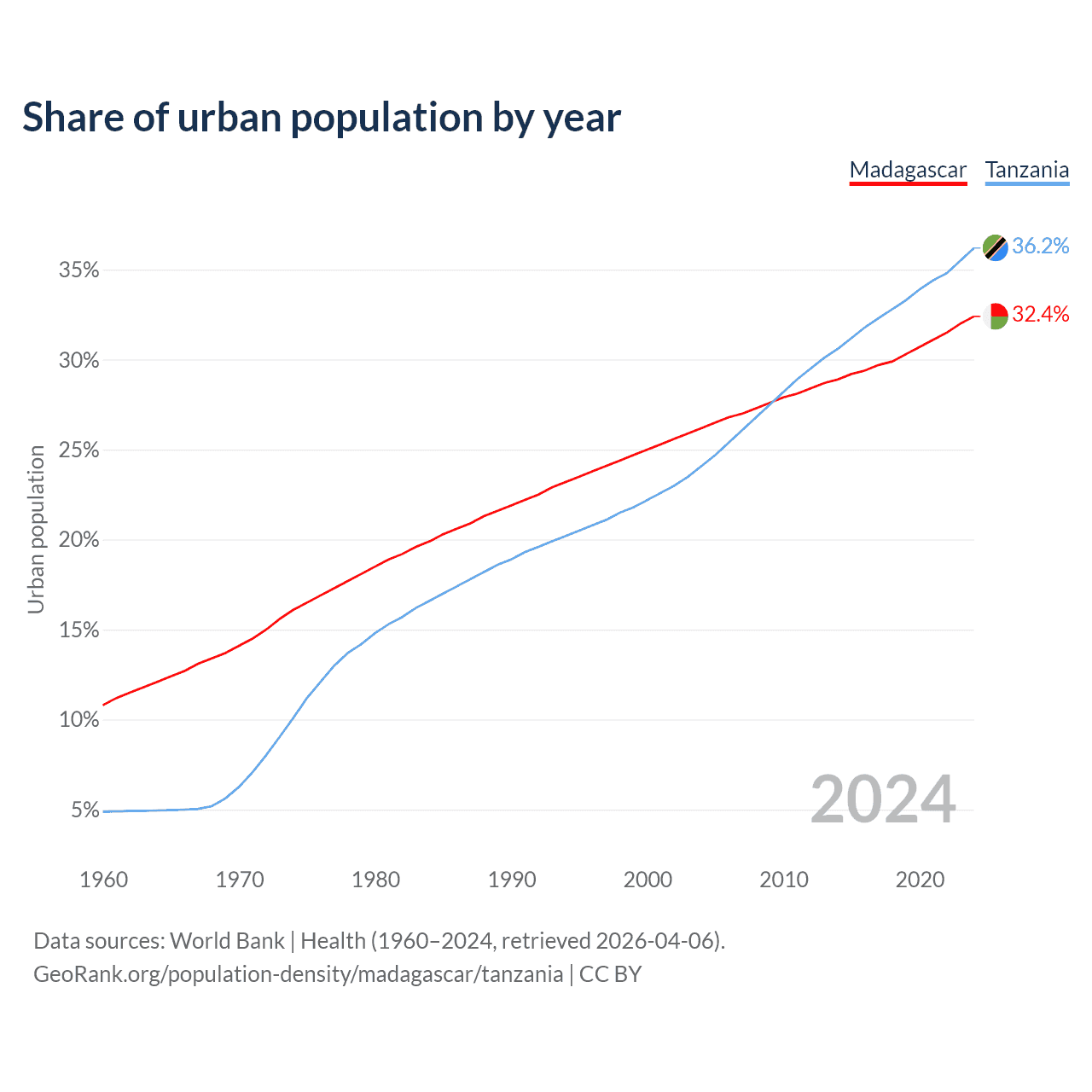 From 2004 to 2024, the share of urban population changed from 26.2% to 32.4% in Madagascar and from 24.1% to 36.2% in Tanzania.