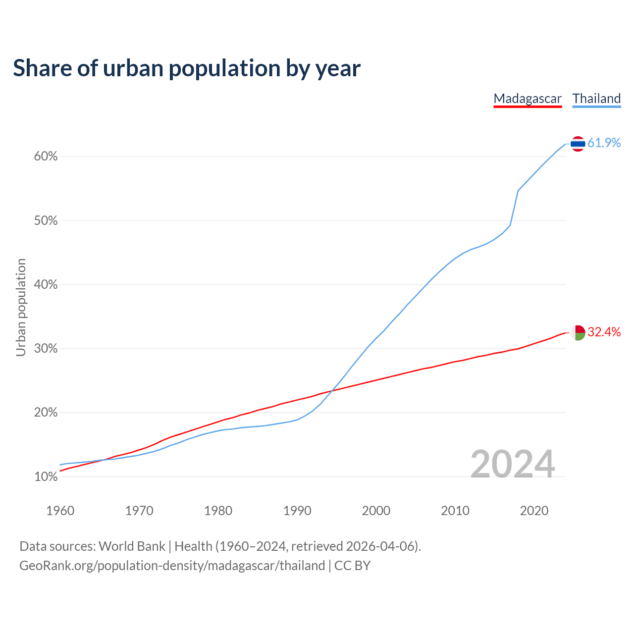 From 2004 to 2024, the share of urban population changed from 26.2% to 32.4% in Madagascar and from 36.8% to 61.9% in Thailand.