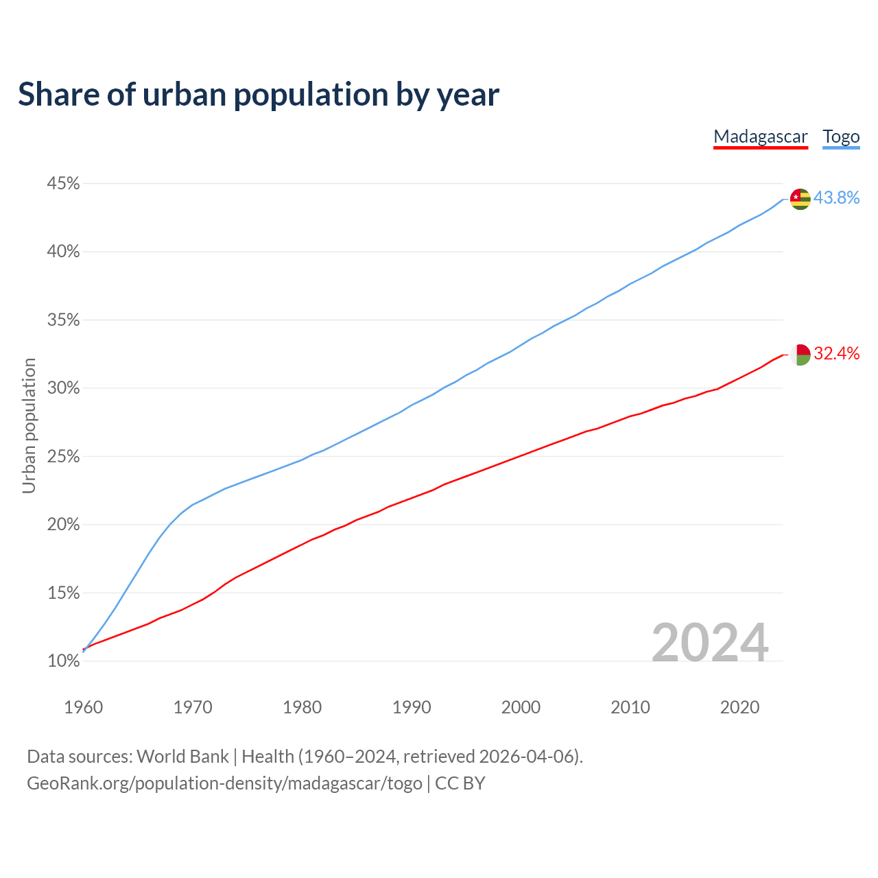 From 2004 to 2024, the share of urban population changed from 26.2% to 32.4% in Madagascar and from 34.9% to 43.8% in Togo.