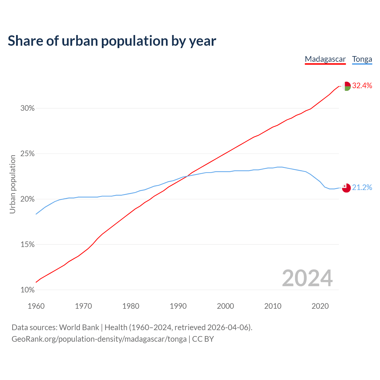 From 2004 to 2024, the share of urban population changed from 26.2% to 32.4% in Madagascar and from 23.1% to 21.2% in Tonga.