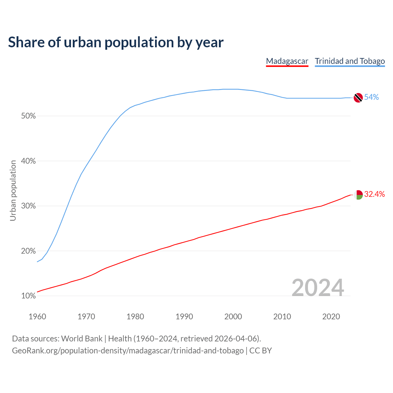 From 2004 to 2024, the share of urban population changed from 26.2% to 32.4% in Madagascar and from 55.6% to 54% in Trinidad and Tobago.