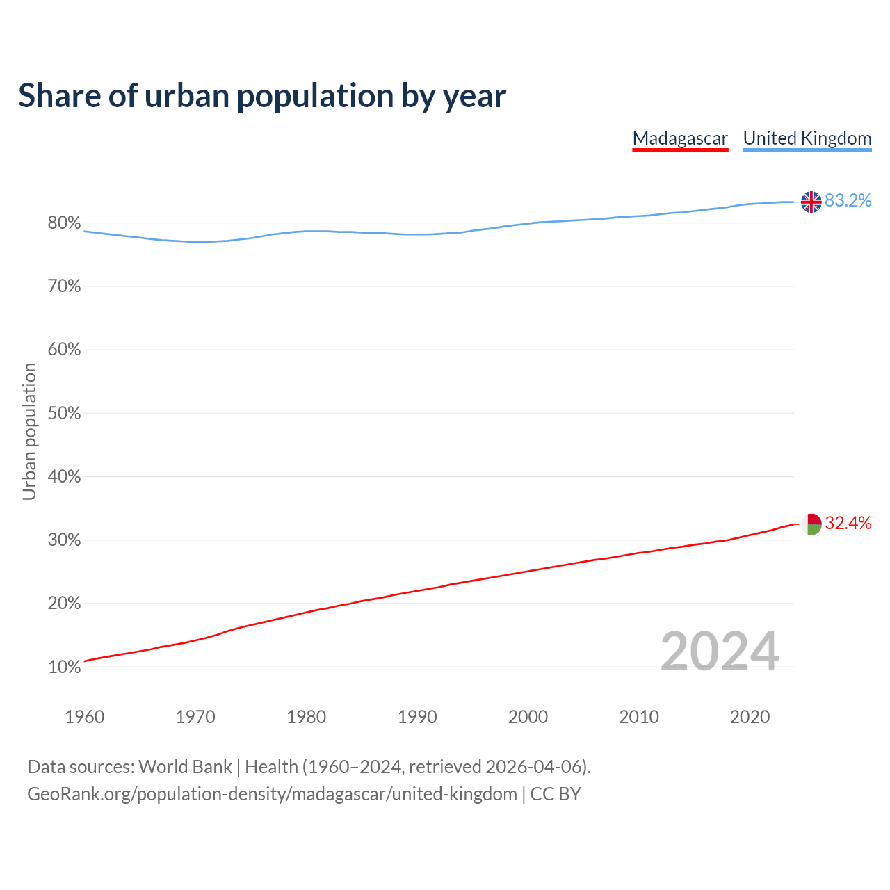 From 2004 to 2024, the share of urban population changed from 26.2% to 32.4% in Madagascar and from 80.3% to 83.2% in the United Kingdom.